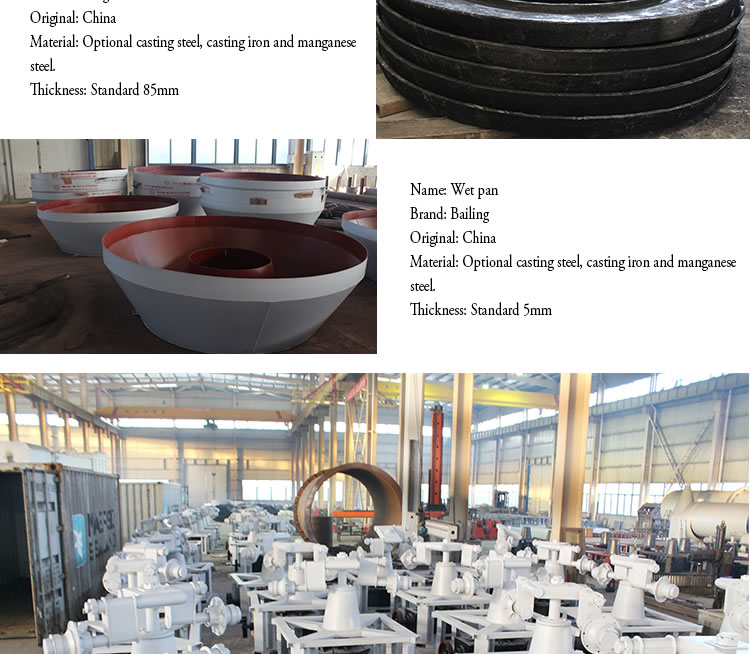 Wet pan mill is widely used for selecting ferrous metals, nonferrous metals and nonmetals, as well as precious metals like gold and silver. It mainly consists of driving device, frame, water basin, grinding wheels and grinding base, etc. It grinds ores by wheel driving force: firstly, the power is transferred from the motor to the reducer, then to the horizontal shaft, and finally to the grinding wheel; the wheels then rotate anticlockwise. The wheels can revolve around the vertical shaft of the pan mill, at the same time, it can revolve on its own axis, while the grinding base will remain still. The ores are then pressed, rubbed and grinded repeatedly.